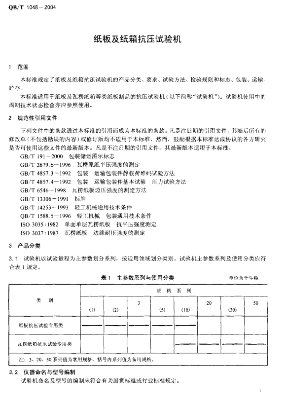 本標準自實施之日起,代替原輕工總會發(fā)布的輕工行業(yè)標準QB/T1048-1998《紙板及紙箱抗壓試驗機》。